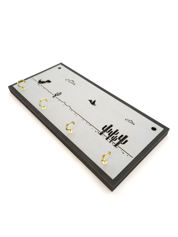 Realizado en MDF, cortado con láser y pintado y ensamblado a mano.