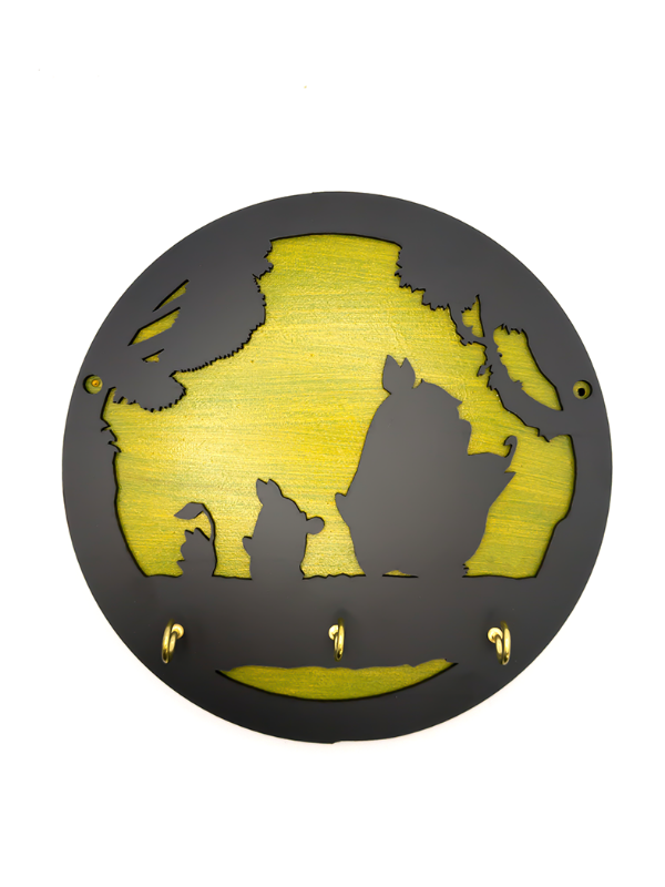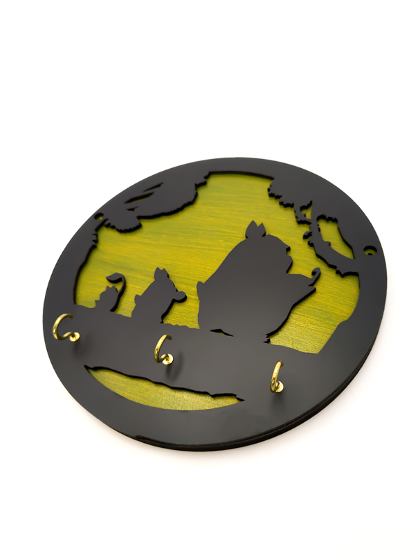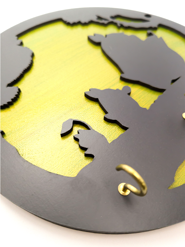 Realizado en MDF, cortado con láser y pintado y ensamblado a mano.